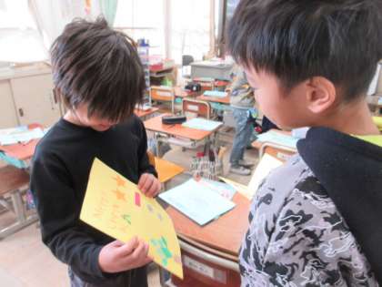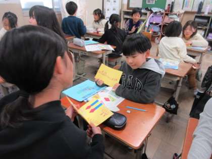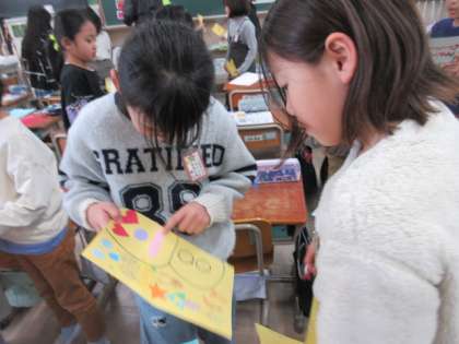 外国語活動で、いろいろな形の色画用紙を組み合わせてカードづくりをしました。クリスマスカードや誕生日カードなど、素敵なカードができあがったので、この日はみんなに紹介しました。みんな、とてもいい笑顔で見せ合っていました。