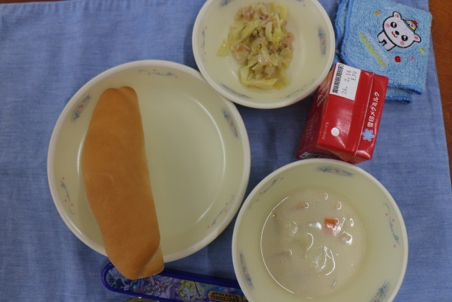 子どもたちの大好きな献立でした。キャベツたっぷりのツナサンドの具は、パンにはさんでパクパク食べていました。