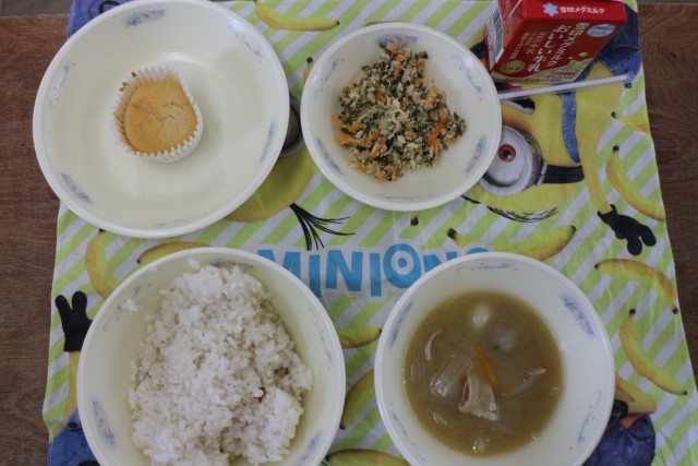 今日は「とりとすぐきのまぜご飯(具)、豚汁、みやこ焼き(黒豆)」でした。