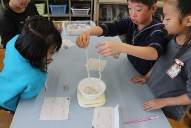 ものの形をかえると、重さは変わるのかを、粘土と画用紙を使って調べました。