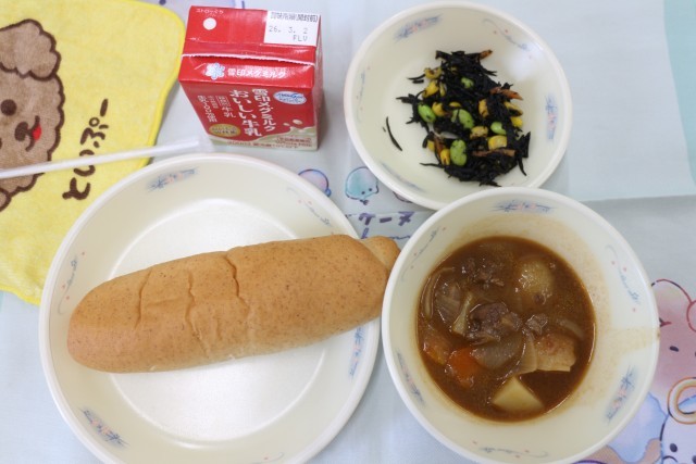 今日は「全粒粉パン」「ビーフシチュー」「ひじきのソテー」でした。