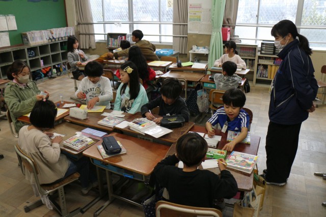 6年生がお別れ遠足へ行っているので、5年生がリーダーになって下級生に優しく指示を出していました。