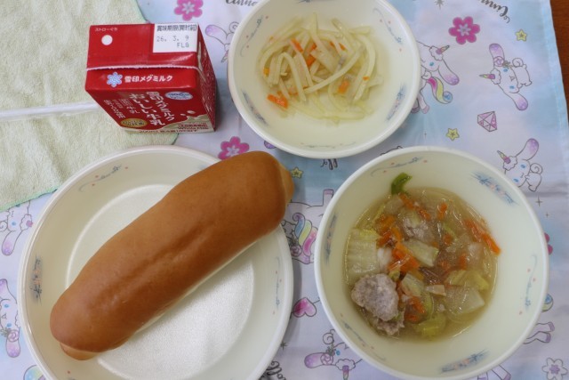 今日は「ミルクコッペパン」「肉団子のスープ」「じゃがいもの炒め物」でした。