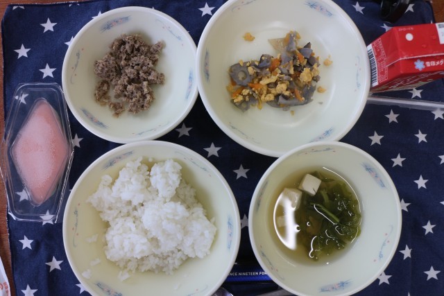 今日は「ちらしずし(具)」「さばそぼろ」「菜の花のすまし汁」「三色ゼリー」でした。
