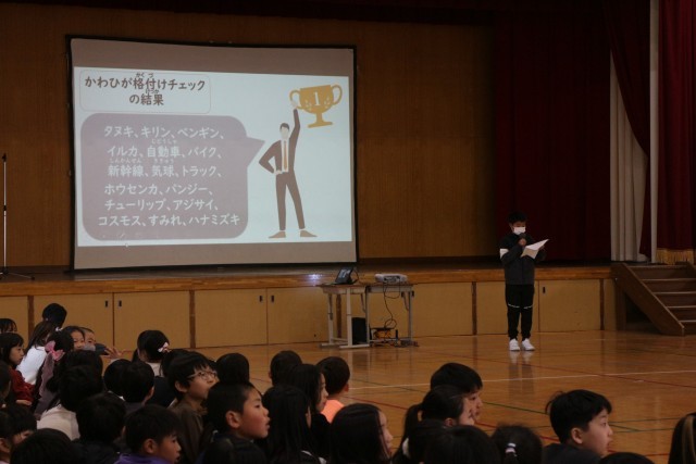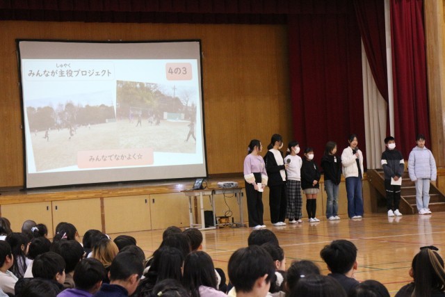 その後は、今月の月目標の『みんなが主役プロジェクト』をクラスで実施している4年生3クラスの代表が実施したことを発表しました。