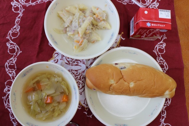 今日は「おさつコッペパン」「ペンネの豆乳グラタン」「野菜のスープ煮」でした。