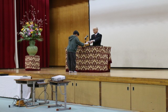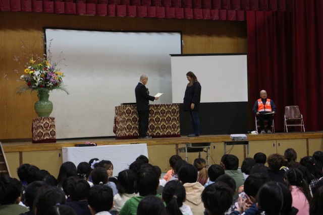 修了式の前に、見守り隊の感謝状贈呈式がありました。1年間、子どもたちが安全に登下校出来たのは、地域の見守り隊のおかげです。