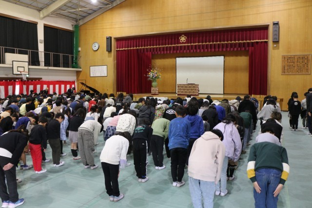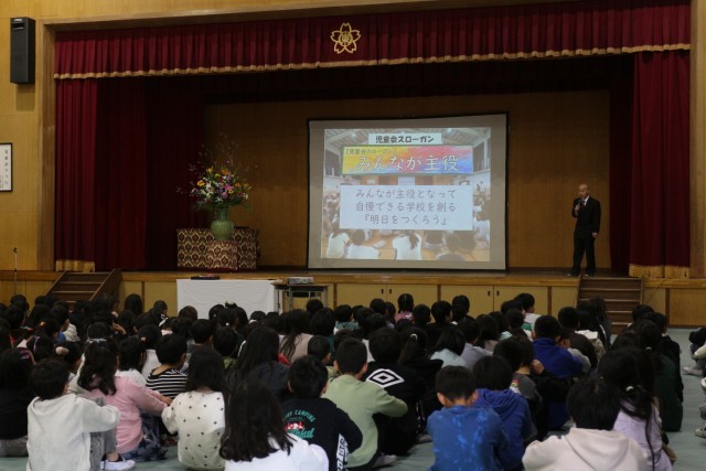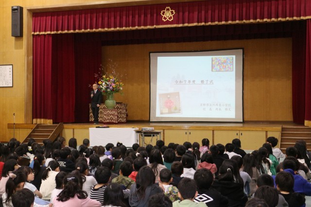 修了式では、1年のふり返りがありました。「みんなが主役」というスローガンのもと、子どもたちは毎日楽しく学びました。