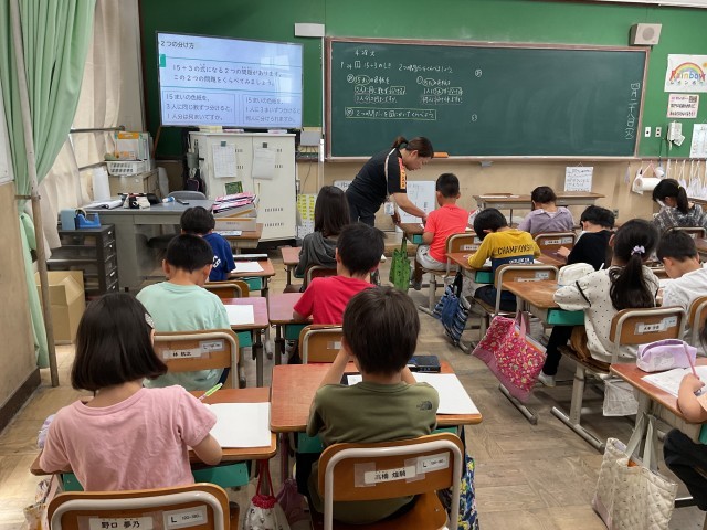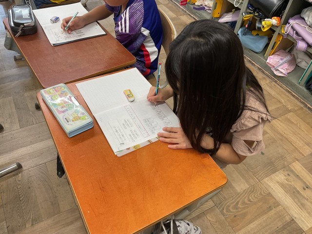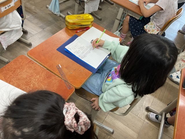 子どもたちは、図に表したり、言葉で説明したりしながら、わり算の意味をじっくり考えていました。