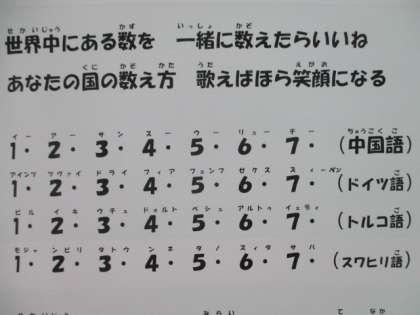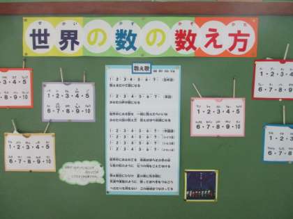 職員室前廊下のさくら教室の掲示板には,いろいろな国の数の数え方を紹介しています。声に出して言ってみましょう。