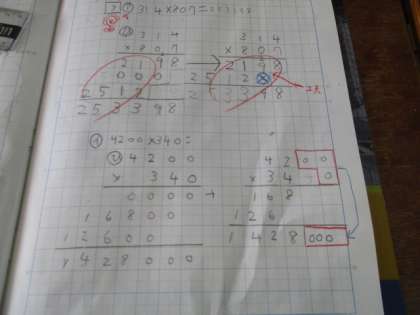 4200×340など0が含まれる場合,どのように工夫して計算するかについて話し合いました。