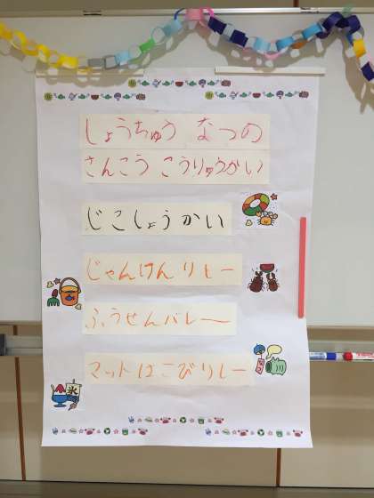 自己紹介のあと,じゃんけんリレー,ふうせんバレー,マット運びリレーをして