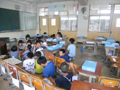 放送で流れた児童会の人の話や、校長先生のお話を聞いています。