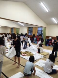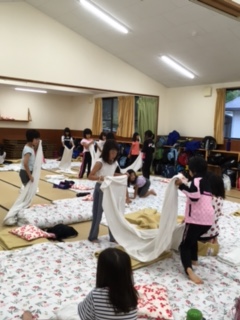 朝起きて,寝具の片づけをしています。できた人から洗面です。
