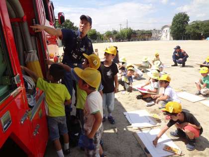 本物の消防車にみんな興味津々でした!暑さに負けず,本物の消防車に負けないぐらいの迫力いっぱいの絵がかけました。