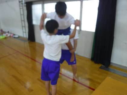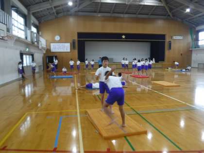 休み時間にも体育館に集まり,1人技・2人技の練習をしています。練習を重ねて,上手になってきた感じがします。