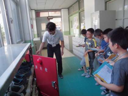 校内の消火設備を調べていると、黒田先生が消火栓を開けて中身を見せてくださいました。