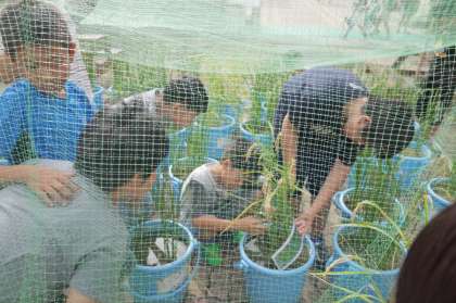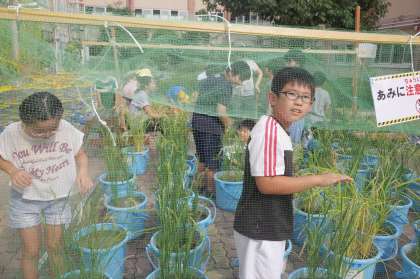 5年生の総合的な学習の時間では,バケツで稲を育てています。
