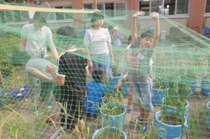 鳥よけの網の中に入っての観察は,とても楽しかったようです。