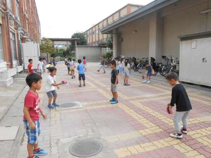 まずはじめに地図や絵本で日本に一番近い隣国を見て,国旗や挨拶なども知ることができました。次に中庭に出て,チェギで遊びました。足で続けて打つのは難しかったようですが,楽しみながら学習することができました。