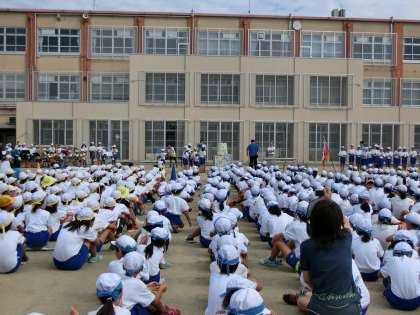 運動会に向けて,開会式の練習です。3年生は1番人数が多く,長い列になりますが,まっすぐにさっと並べるように頑張っています。今年は,聖火が登場し,みんなどのように火が灯るのか興味津々です。