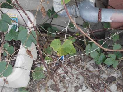 グリーンカーテンの植物がほとんど枯れてしまっている中で,まだまだ元気に咲いているアサガオがあります。実はこのアサガオは少し他の植物とは違っていました。なんと,プランターに植えた花ではなく,こぼれていた土の昨年度こぼれた種から咲いているのです。たくましいですね。