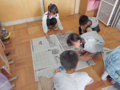 算数科面積の学習で、1平方メートルの正方形を新聞紙を使って作りました。
