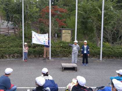 入所式が始まりました。学校の旗をあげます。