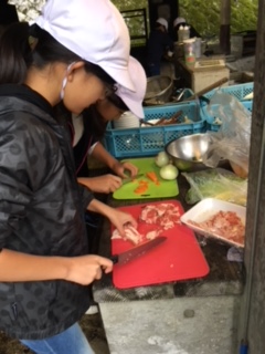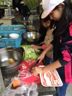 野外炊事が始まっています。決められた役割を果たしています。おいしいすき焼き風煮ができるでしょうか。楽しみです。