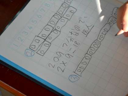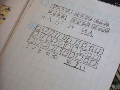 5・2・3・4の九九の学習を終え,まとめをしています。問題文に書いてある数字だけを見て式を立てるのではなく,図に表すと正しい式が立てられました。