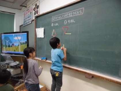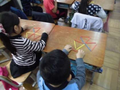 最後には1本動かして形を変えるかえるクイズのような学習もおこない教室から「できた!!」「できた!!」という声がたくさん上がっていました。