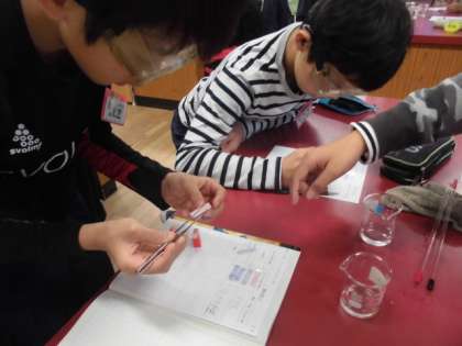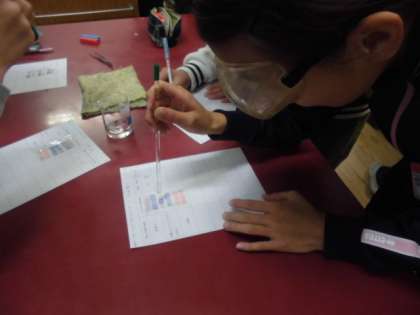 理科で水溶液の学習をしています。リトマス紙を使って反応を見て,水溶液の性質を調べました。実験の約束を守りながら,注意深く観察していました。