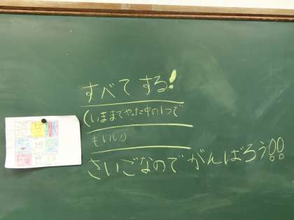 児童会から「あいっぱさんキャンペーン」として各クラスで取り組むことを決めて実践しようとの提案がありました。その提案を受け,1組は「あいっぱさんビンゴ」に取り組みました。代表委員がその日取り組むことを伝え,みんながそれを意識してできたらそのコマをぬって達成できたことを喜び,また続けていこうとする……というものです。いよいよ最後から2日前の日の黒板です。代表委員からのみんなへのメッセージ。最後の日は,「みんながんばったね!これからもつづけていこう!」とのメッセージでした。