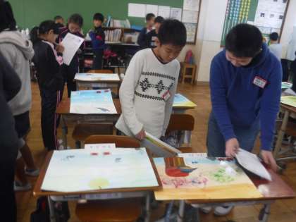 図工の時間にかいた「やまなし」の絵を鑑賞しました。近くで見ると,それぞれの工夫がよく分かりました。友達の作品を見て感心しながら,じっくりと味わうことができました。