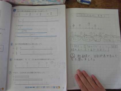 算数では分数の学習を頑張っています。整数と同じように分数も数直線上に表すことができることを学ぶことができました。また,1より大きい分数があることにも気づけました。