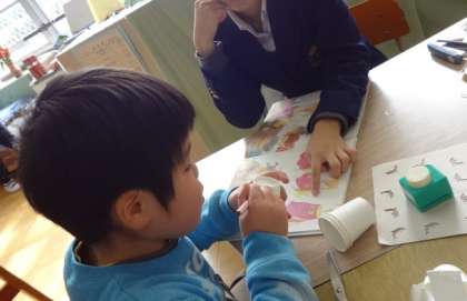 樫原中学校・松陽小学校・樫原小学校の三校交流会がありました。夏にも交流会があったことや,中学生の中には樫原小学校の卒業生さんもいたこともあり,あまり緊張せずはじめから楽しく活動することができました。工作を中学生に手伝ってもらったり,何人かでカードゲームをしたりと交流を楽しんでいたようです。みんなが大好きな工作やゲームをお友だちと一緒にすることができて大満足のようでした。