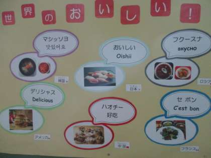 さくら教室の掲示板には,いろいろな国の言葉で「おいしい」を紹介しています。
