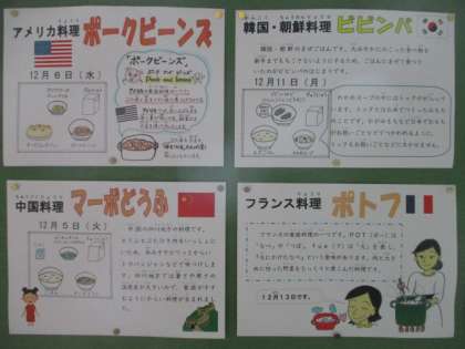その横の給食の掲示板には,給食の献立にある世界の料理を紹介しています。