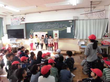 2年生ありがとうの会を行いました。子ども達が企画した出し物は工夫がたくさんあって2年生の笑顔も一年生の笑顔も光っていました。