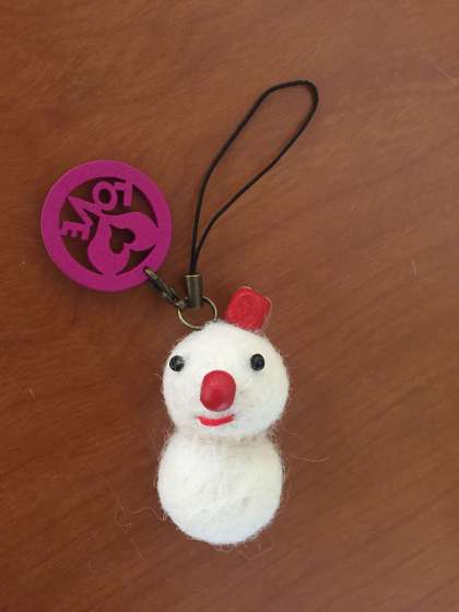 フエルトボールをニードルを使ってつないだら,雪だるまができあがりました。