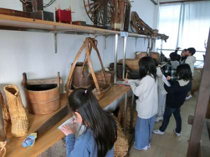 社会科の学習で昔の道具を見に,校内の郷土資料室に行きました。沢山の展示物に多くの子が驚いていました。興味をもって見たりノートに名前をメモしたりしていました。