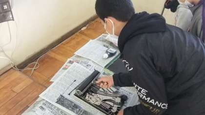 版画はいよいよ仕上げの「刷り」の作業に入りつつあります。今回の題材は浮世絵なので,江戸時代の人達もこんな風にしていたのかなと想像しながら,彫ったり刷ったりしています。背景を工夫して,味わいのある作品ができてきました。