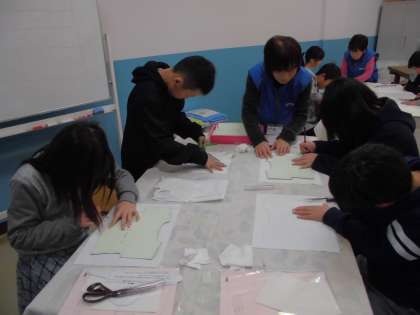 工房学習で、ぬいぐるみのTシャツを作っている様子です。