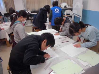 型紙の形を写した布を、裁ちばさみで切っています。布が柔らかく、難しいようですが、丁寧に作業をしていました。