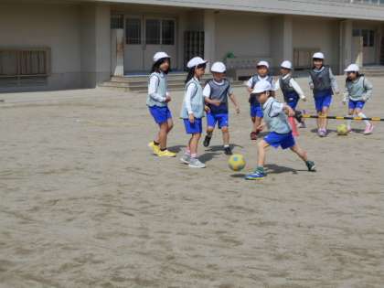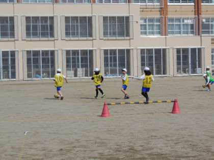 今日はとてもいい天気。思い切りボールを追いかけて,元気に学習しました。