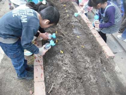 12月8日(水),1年生ではだいこんのたねを植えました。みんなのたねがどこに植えたか分かるように名札を立てました。植えた後,水やりをしました。どんなだいこんができるか楽しみです。
