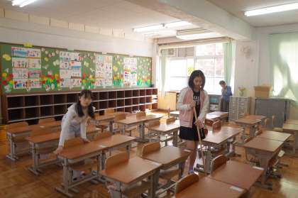 お道具箱のを動かして机の上を拭いたり,机や椅子を並べたり・・・