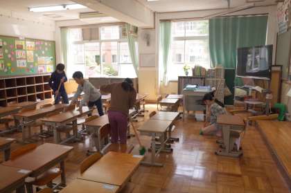 1年生が集団下校をしている間は,6年生が1年生の教室を掃除しています。
