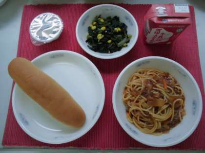 金曜日は,小型コッペパン,スパゲティのミートソース煮,ほうれん草のソテー,牛乳