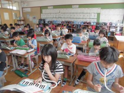 音楽では「いいことありそう」の歌に合わせて鍵盤ハーモニカを弾きました。元気な歌声と鍵盤ハーモニカの音が合わさり素晴らしい音楽になりました。